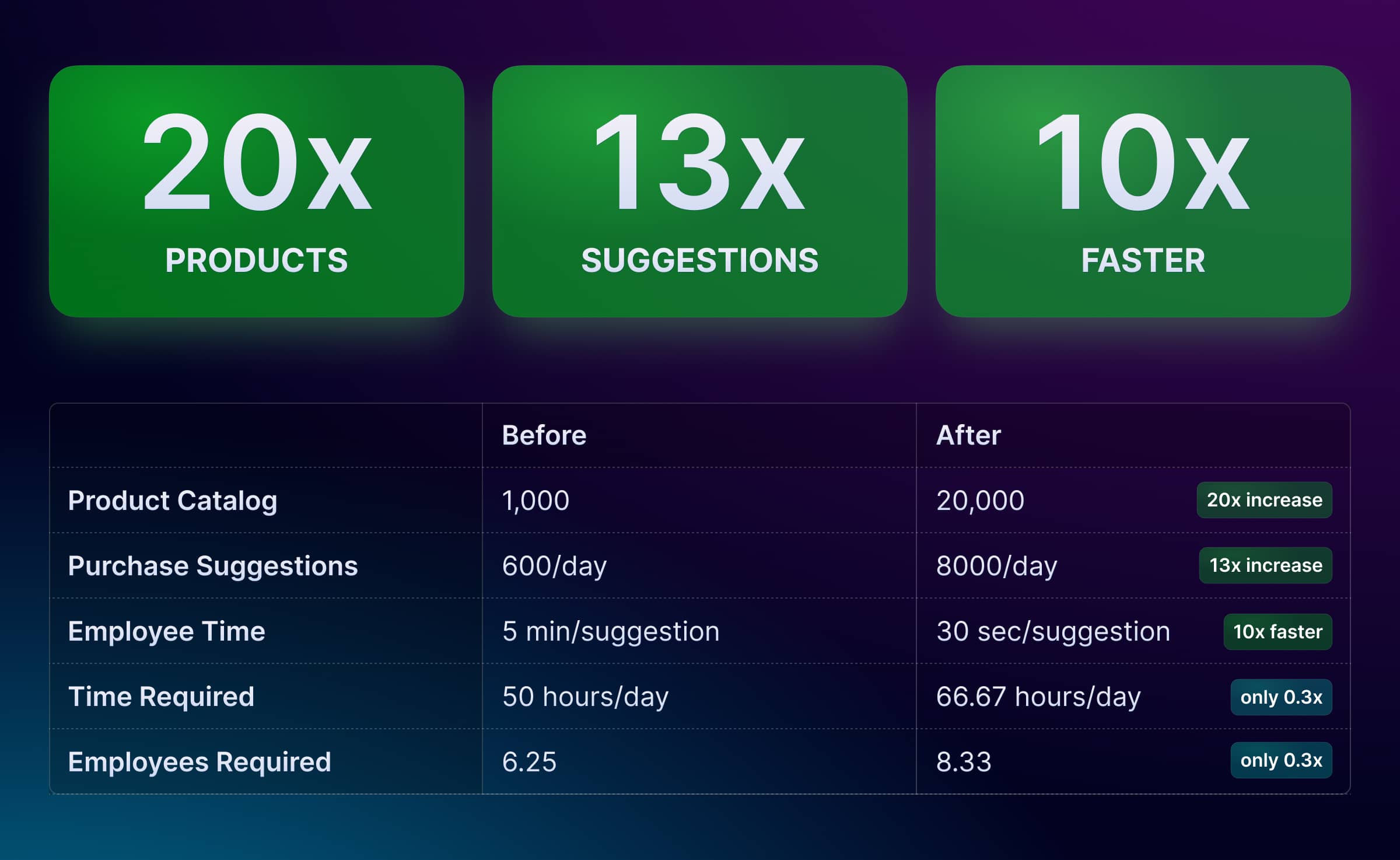So what does that mean? With a staff increase of only 33%, we were able to amplify the daily purchase suggestions from 600 to an astounding 8000—a 13-fold increase. This also expands the potential product catalog to 20,000 items, up from a mere 1000.
