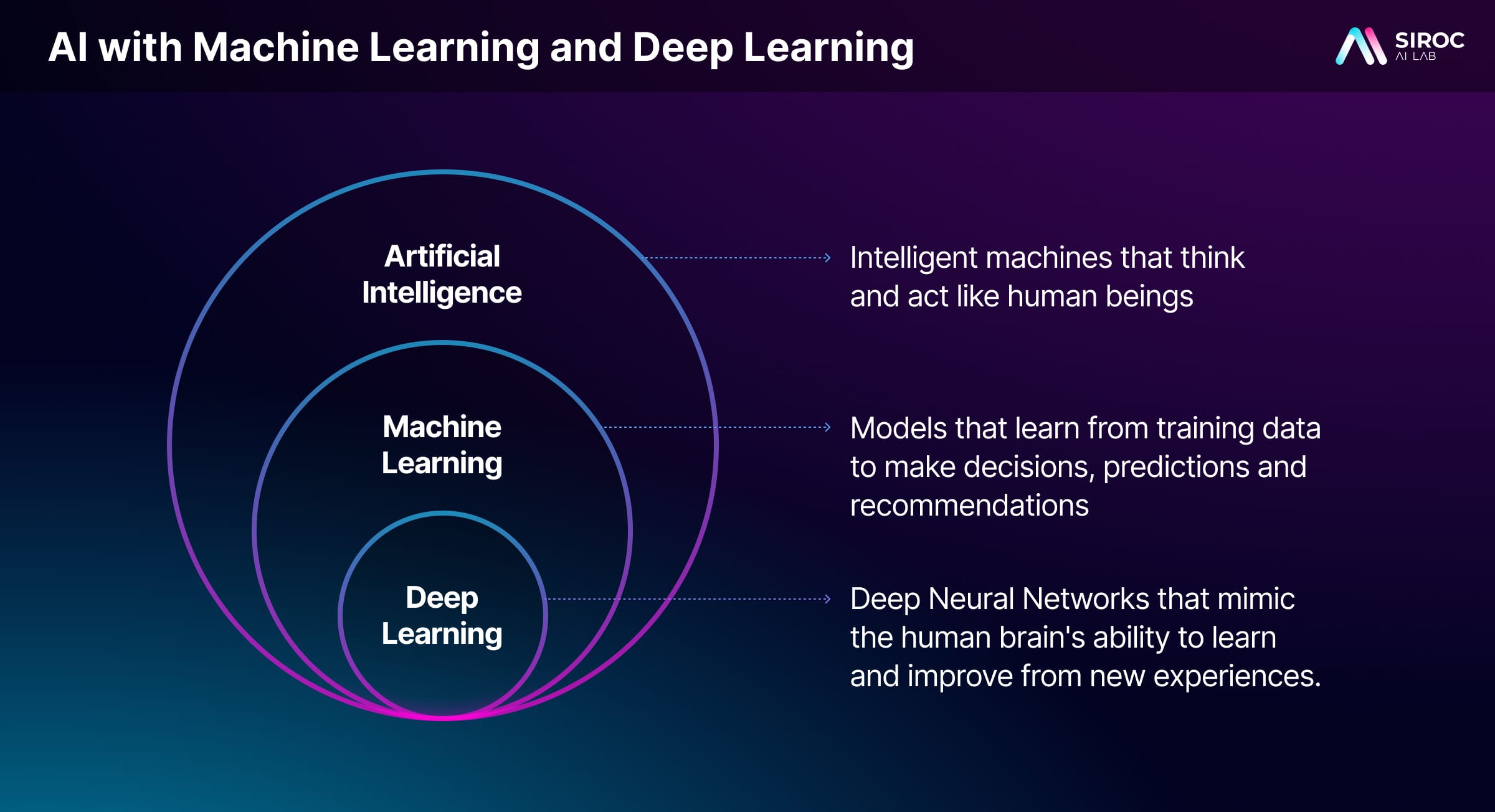 AI is the broadest concept of the three, encompassing any technique or approach that enables machines to perform tasks that typically require human intelligence. The term AI itself focuses more on the utility of enabling interactions between humans and intelligent machines than on the underlying techniques that make up those machines. AI includes both traditional rule-based systems and more modern learning-based approaches.